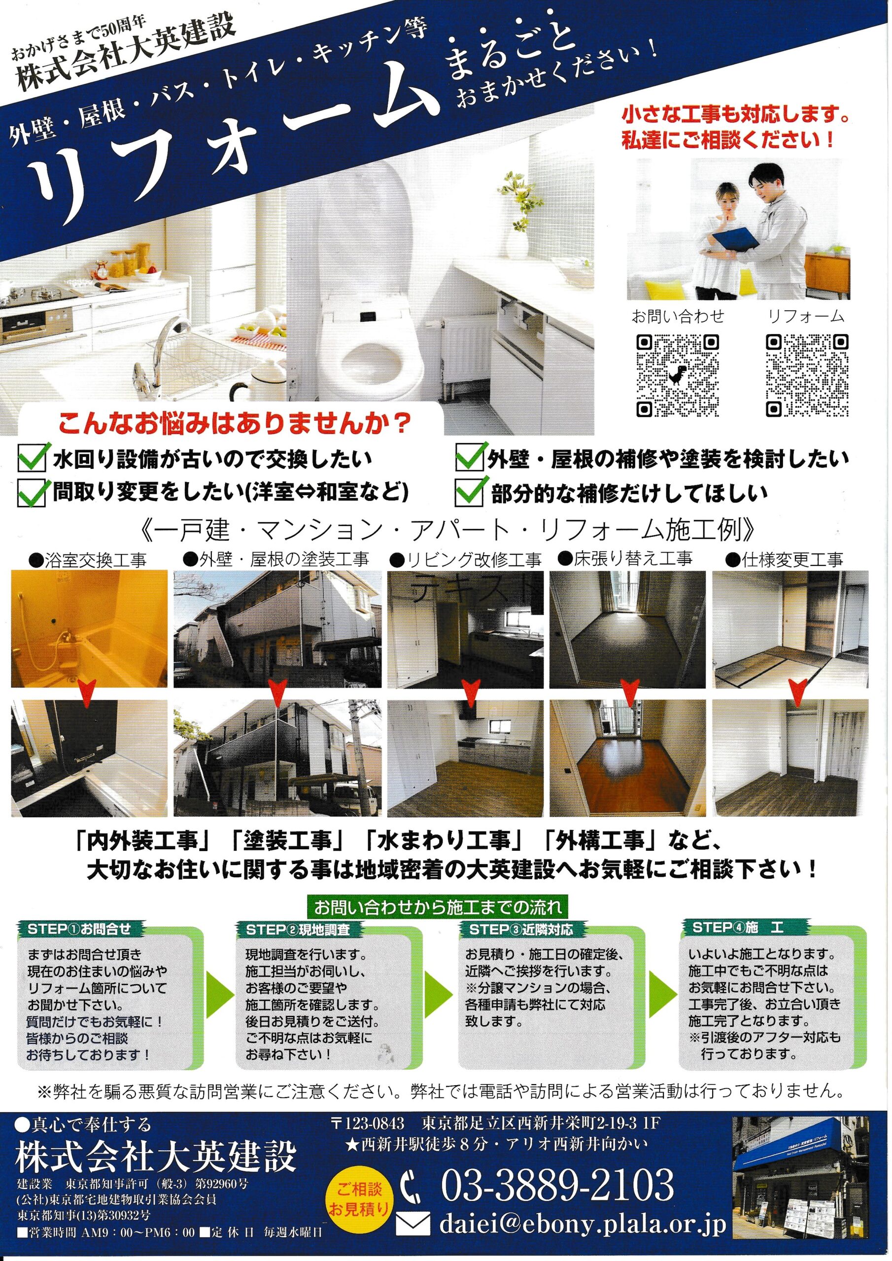 【訪問営業に関するお問い合わせ先】株式会社大英建設 西新井支店 03-3889-2103