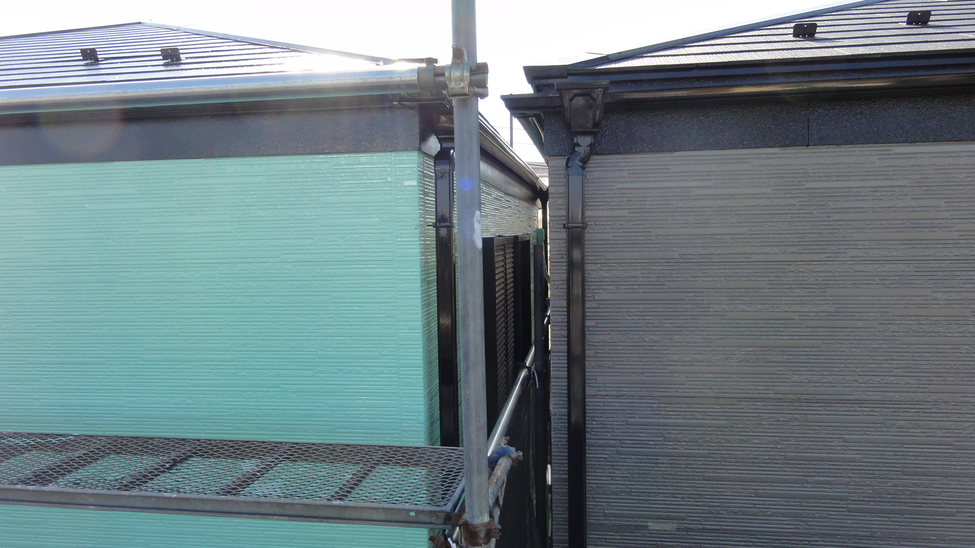 右側の建物はクリヤー塗装、左側の建物は塗替えを実施しました。