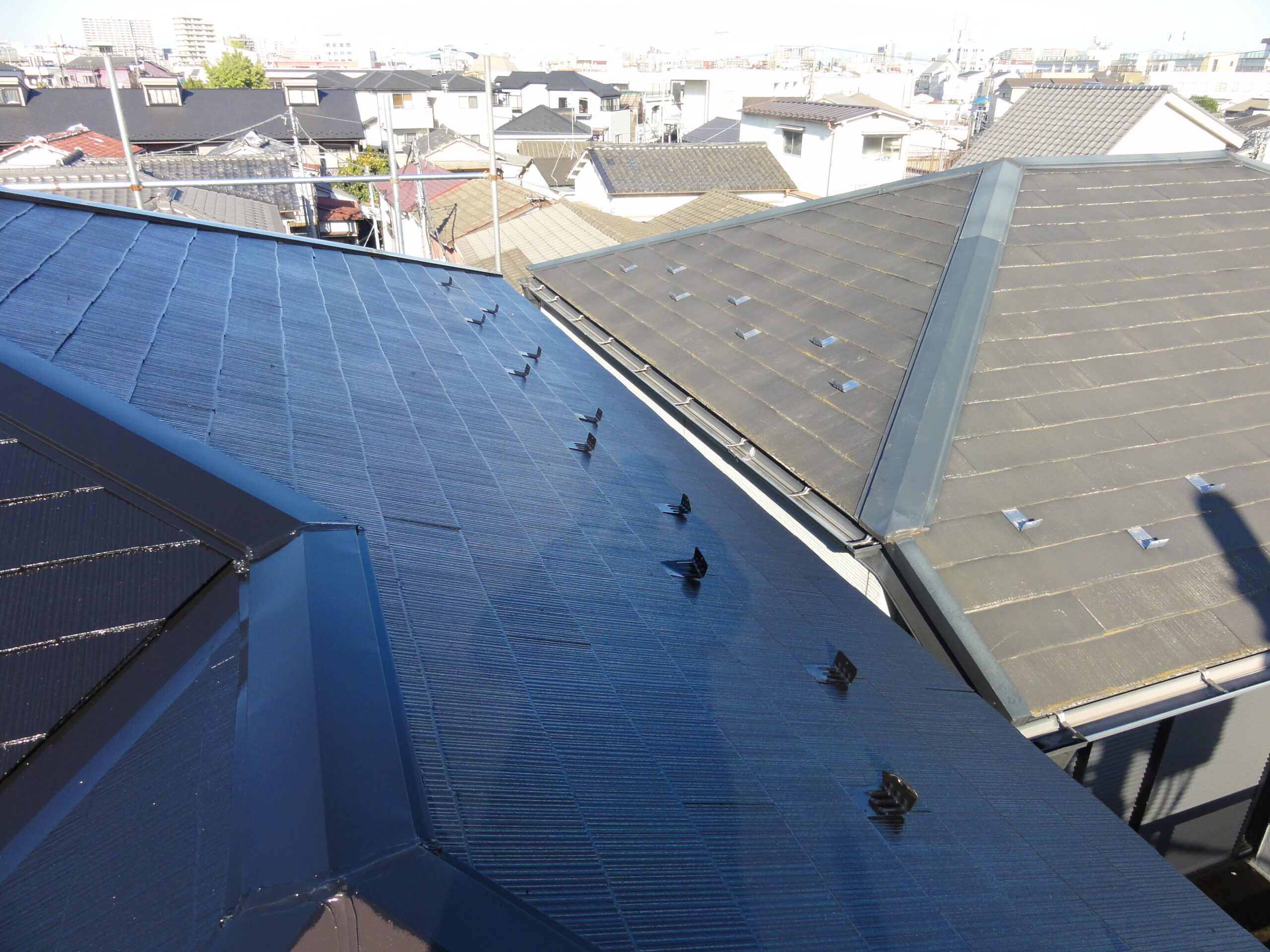 施工前の状態は、年数相当の色褪せはでていましたがスレートの割れや棟板金に錆もなく、
